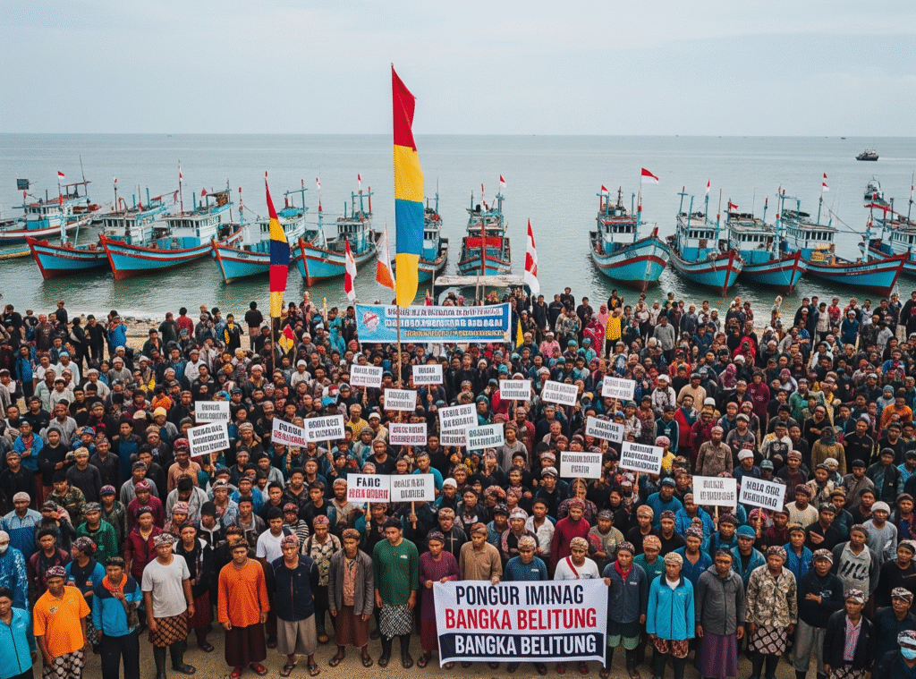 Pangkalpinang, NazaraNews.com – Ratusan nelayan dari berbagai wilayah pesisir Bangka Belitung menggelar aksi demonstrasi besar-besaran di depan Kantor Gubernur Bangka Belitung pada Selasa (22/7). Aksi ini merupakan bentuk protes keras terhadap maraknya aktivitas pertambangan timah di laut yang dinilai mengancam mata pencarian dan merusak ekosistem perairan tangkap ikan mereka.